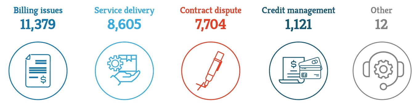 Billing issues were raised most often in wireless and TV complaints. Service delivery concerns were raised most often by internet and local phone customers.
