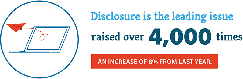 Customers often raise concerns about information not being fully or clearly provided. This is reflected in the data, as disclosure issues continue to be the top issue. Disclosure issues were raised 4,222 times this year across all service types and account for 15% of all issues raised across all service types. Disclosure issues decreased for the third year in a row and decreased by 8% from last year.