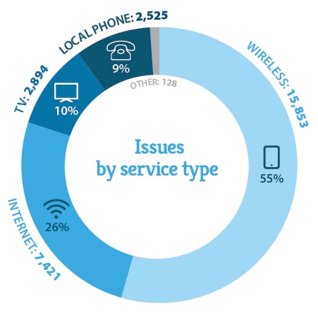 - Wireless remains the most complained-about service. Wireless issues increased by 6% from last year.
