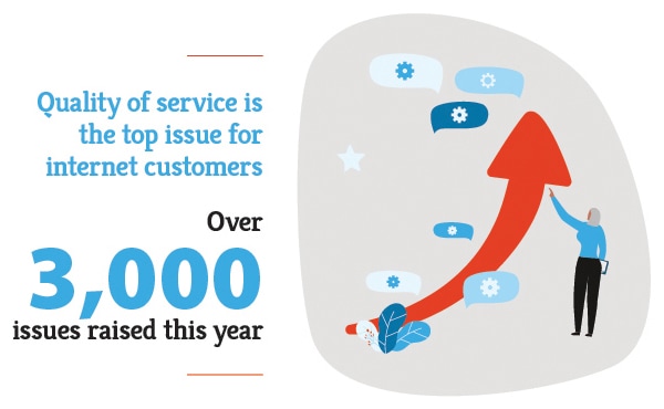 For internet customers, quality of service issues continue to be the leading concern, accounting for 16% of all internet issues. Internet customers also account for the highest proportion of quality of service issues at 39%, down from 44% last year.
