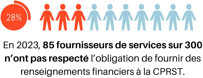 En 2023, 85 fournisseurs de services sur 300 n’ont pas respecté l’obligation de nous fournir des renseignements financiers. La liste complète des FSP non conformes se trouve à l’annexe A.